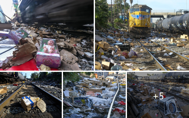 【吃瓜热点】美國洛杉磯貨運列車遭盜竊情況猖獗,小偷趁火車減速或暫停於路軌時作案。他們撬開車廂門鎖入內,拿走值錢物品後逃去。他們將大批紙箱及廢物等棄於路軌,此事被媒體報道後引發熱烈討論。人們終於知道,那些永遠無法到手網購貨品已往哪去了。
