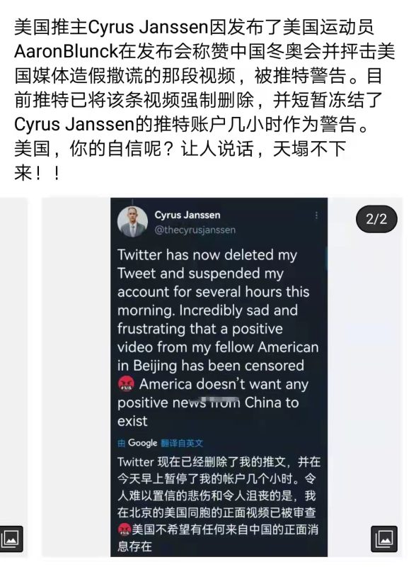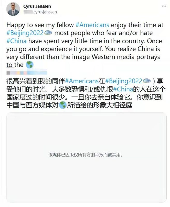 近日,微信群传有人赞美北京冬奥,被推特封号,未知真假。