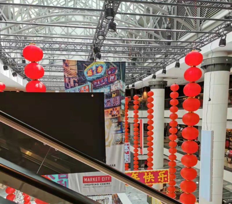 相反,唐人街对面的MARKET CITY则是喜庆气氛浓厚,大红灯笼高高挂。