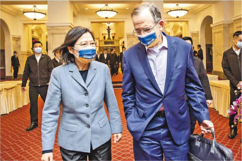 圖- 俄羅斯侵略烏克蘭勢將影響台海局勢與美國印太戰略佈局。圖為台灣“總統”蔡英文在社交平台貼出她(左)周三(2日)接待到訪的美國參謀長聯席會議前主席穆倫(右)時,二人皆戴上有烏克蘭國旗顏色、寫有「跟烏克蘭同一陣線」的口罩。(網上圖片)