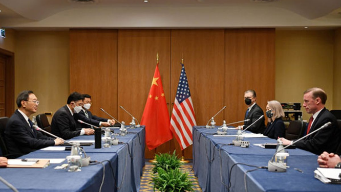 图:2022年3月14日,中共中央政治局委员、中央外事工作委员会办公室主任杨洁篪(左一)同美国总统国家安全事务助理沙利文(右一)在意大利罗马举行会晤。