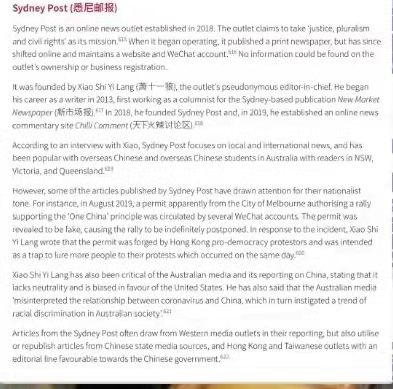 ASPI和澳大利亚国家情报局二个机构根据长达20个月的追踪调查,在2020年12月公布了包括对《悉尼邮报》等24家中文媒体的研究报告结果。