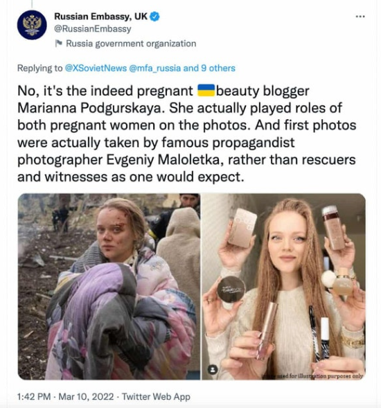 3月10日,俄羅斯駐英國大使館發Twitter指一名在馬里烏波爾空襲中喪生的孕婦為烏克蘭美妝博主假扮。(Twitter截圖)
