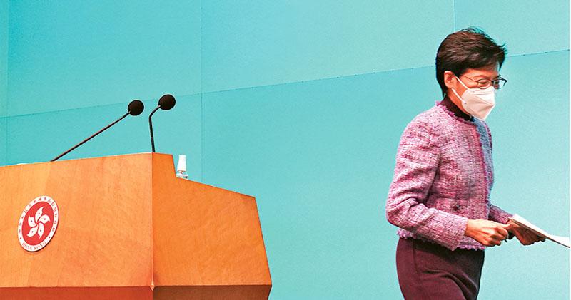 圖 – 一如近期安排,特首林鄭月娥昨上午11時舉行記者會,但背景不再有抗疫相關的相片或標語。全身紫色打扮的她開場時稱,昨日仍是抗疫新聞發布會,但此前要先公布,她不會參選下屆特首選舉,最終她說,「看來大家都沒有關於抗疫的問題,所以今天的記者會到此為止」,歷時約20分鐘。(聯合採訪)
