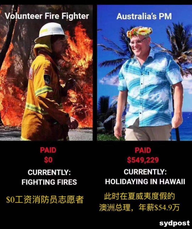 莫里森频频道歉,还频频被打脸,脸皮不够厚都不行。活得太累了,做总理也太难为他了,放他走吧,让他可以月月去夏威夷度假,无需再顾虑什么山火了。。。