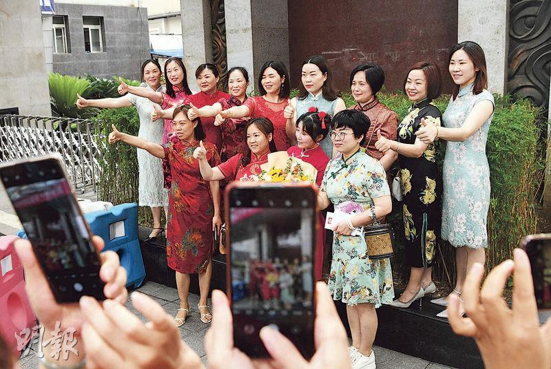 圖 – 為替考生加油,高考期間各地大小考點都有家長於考場外留守等待,在重慶市第一中學高考考場,有家長穿着旗袍,希望自己的孩子在考試中「旗開得勝」。