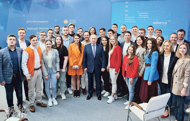 图- 俄羅斯總統普京(前中)周四在莫斯科與出席一個國際經濟論壇的年輕企業家、專家合照。他在該會上講話時提到締造俄羅斯盛世的彼得大帝,暗示對烏克蘭興兵只是為收復俄國固有領土。(路透社)