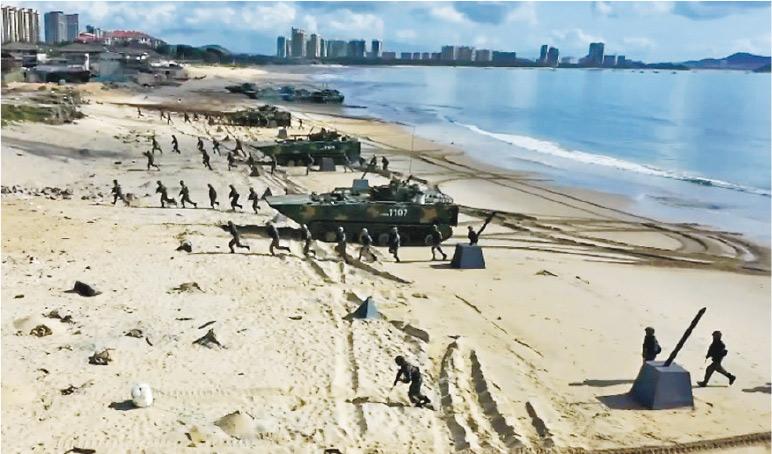 圖- 隸屬解放軍東部戰區的第73集團軍某兩棲合成旅,近日在閩南某海域組織海上突擊演練。兩棲合成部隊由裝甲、偵察、火力等數十種兵種力量融合而成,「央視軍事」昨發布影片,可見該兩棲合成旅登陸搶灘的情况。(影片截圖)