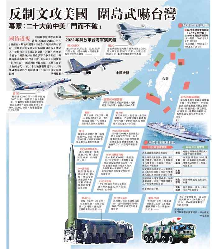 【台海一线】美國聯邦眾議院議長佩洛西(Nancy Pelosi)本月3日離台,解放軍隨即4日起在台灣周圍海空軍演,翌日外交部又宣布制裁佩洛西及其家人,並推出對美8項反制措施。對此,台灣學者表示,佩洛西訪台嚴重影響了中美互信,但相信兩國仍維持「鬥而不破」的局面;而解放軍「鎖台軍演」,既是對台極限施壓,又是在面子上有個交代,「但二十大後就很難說了」。大陸學者則說要以空間換時間,「消耗美國衰落的餘威」。