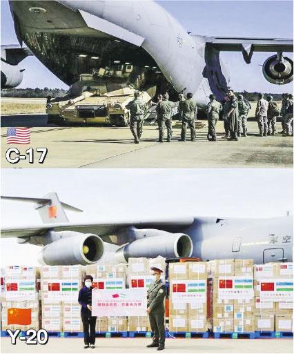 华外交部發言人華春瑩前日(24日)在Twitter發布一組對比圖,對比中國與美國帶給世界其他地區的事物,並配文稱「破壞與建設(Destruction & Construction)」。有內地媒體指,上圖是美軍C-17運輸機正在境外向地面輸送坦克;下圖是中國空軍運-20運輸機,正為烏茲別克送防疫物資,暗指「美國送破壞、中國送建設」。
