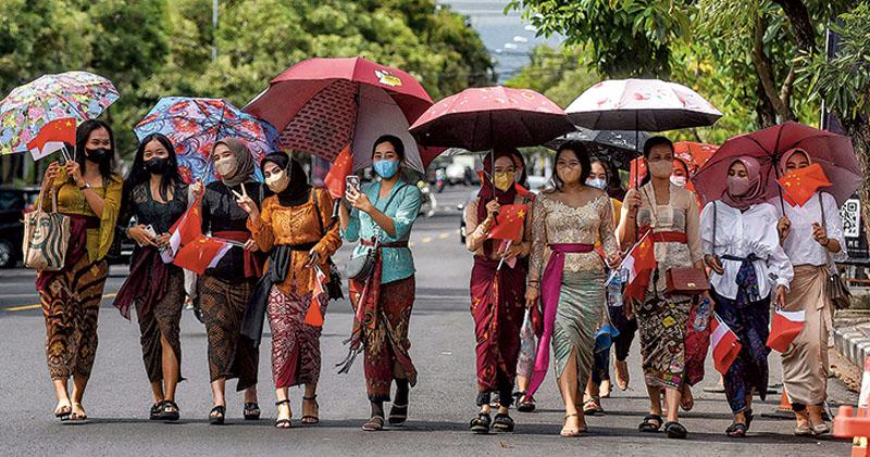 圖 – 一群印尼女子昨天手持中國等與會國的國旗,準備歡迎抵達峇里島出席G20峰會的領袖。(法新社)
