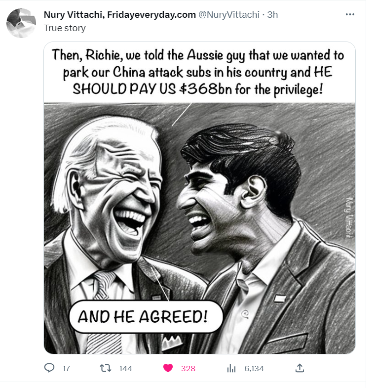 另外,花费了澳洲纳税人巨资的AUKUS很可能是奶妈奶人家的孩子。澳洲政府说的两万就业被大多数人误解是澳洲的工作,澳洲没有核武器经验,实际上大部分高附加值的工作都在美国和英国,只有数千普通工作在澳洲。普通澳洲老百姓每天惦记的无不是在哪挣下一两碎银。