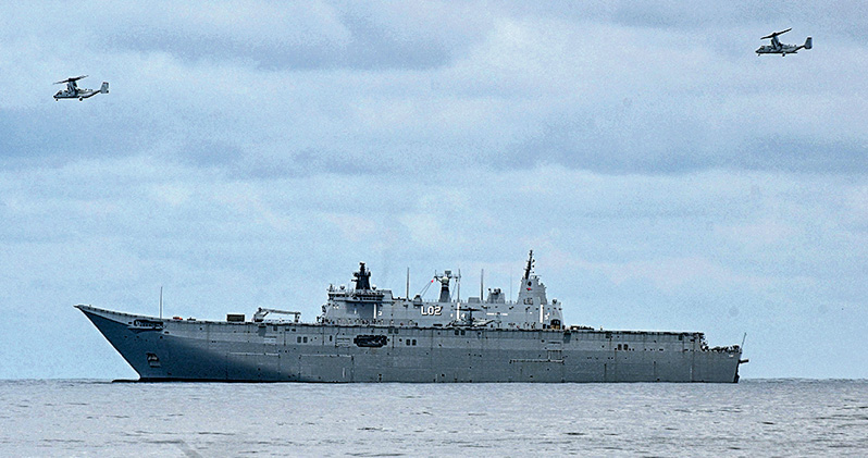 圖- 菲律賓北部三描禮士省去年8月舉行該國及澳洲聯合軍演,圖為美國海軍陸戰隊MV-22「魚鷹」式軍用飛機,飛越澳洲直升機船塢登陸艦「坎培拉」號。美澳日菲今天將在南海舉行聯合海空軍演。(法新社)