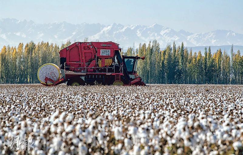 圖- 歐盟曾以新疆人權狀况為由限制進口新疆棉花,但由於軍火商高度依賴中國棉絨,擔憂中國藉此製造障礙。圖為2021年10月24日,一輛採棉機在新疆塔城地區沙灣市的棉田內工作。(資料圖片)