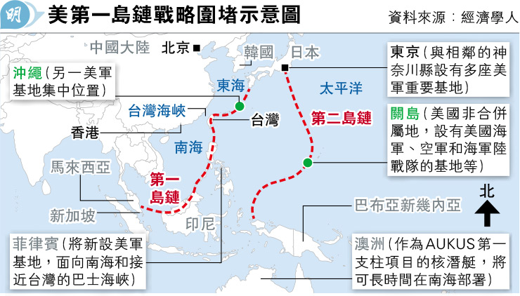 嶺南大學政府與國際事務學系教授張泊匯向本報表示,美日菲澳軍演可意味着美國終於有能力做到「聯合全部第一島鏈(軍事)資產(按:指涉武器、後勤及其他軍事設備或戰力等的軍事術語)來圍堵中國的軍事力量」。第一島鏈則北起日本,中連台灣,南接菲律賓(以至馬來西亞和印尼),屬於美國太平洋制華戰略的首道防線,其中日本和菲律賓都是美國軍事盟友,前者有美軍常駐,後者則新近容許美軍重新設立基地,台灣軍事上同樣跟美國關係密切。張泊匯直言,華府肯定希望這條島鏈不會被打破,從而封鎖中方冒起中的海軍力量,而這條島鏈不可避免地代表着將東海、台海和南海這三個對美國重要的地區連結在一起。