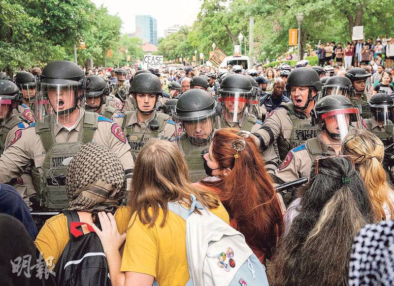 圖- 身穿防暴裝的得州州警周三在得州大學奧斯汀分校,嘗試驅散親巴人示威。(路透社)