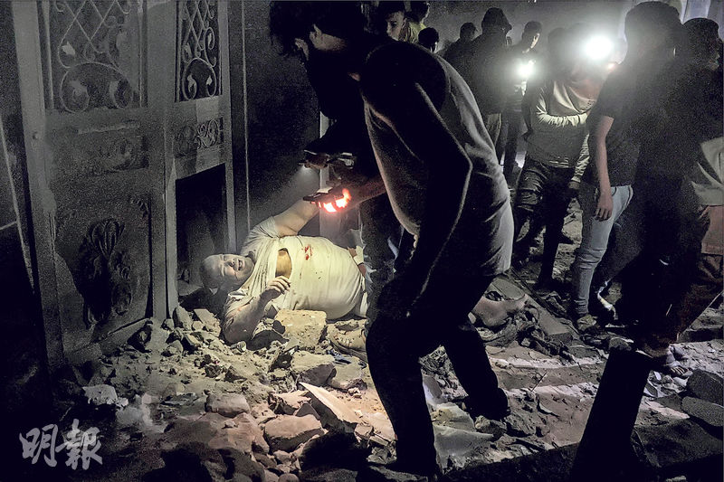 圖 – 加沙南部拉法市一座建築周二遭以軍轟炸後,有人手持電筒走近躺在瓦礫中的傷者。(法新社)