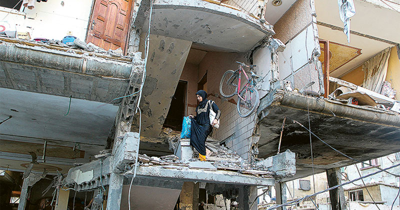 圖 – 一名巴人女子昨於拉法市一間在以軍轟炸中重創的房屋殘骸中行走。美國總統拜登周三警告,如以軍大規模開進拉法市,將暫停對其供應重磅炸彈等攻擊武器。(路透社)