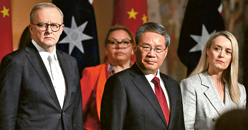 中国国務院總理李強於當地時間周一(17日)在坎培拉會晤澳洲總理艾博年(Anthony Albanese)時指出,中方願同澳方不斷擴大貿易規模,積極拓展新能源汽車合作,希望澳方為雙方人員往來提供更多便利,反對陣營對抗和「新冷戰」,建設開放型世界經濟。兩國總理一致同意堅持中澳全面戰略伙伴關係定位,鞏固中澳關係改善發展勢頭,共同維護地區和世界和平、穩定與繁榮。