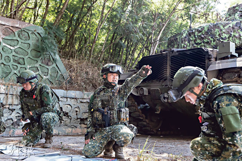 圖 – 台軍第一作戰區戰車營昨接獲命令後,參演官兵協力完成作戰整備。台軍的漢光40號實兵演習昨正式上演,以「本島實兵不實彈,外島實兵實彈」演練。