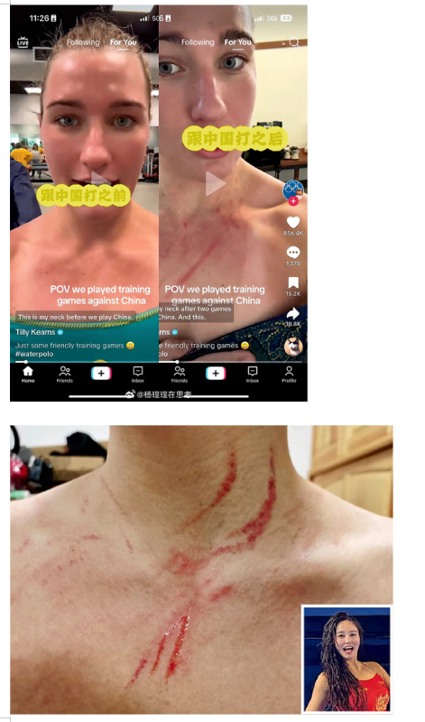 26歲「水球女神」熊敦瀚在社交媒體十分活躍,也被捧為巴奧「十大美女運動員」之一。紅人易惹話題,有網民翻出澳洲水球運動員Tilly Kearns早前在TikTok上的帖子,她展示與中國隊友誼賽前後的對比,訓練後胸口出現抓痕,暗示中國運動員在訓練賽中抓傷了她。