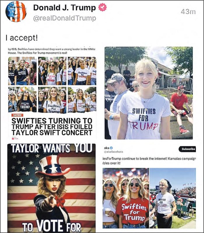 特朗普屢發AI相 選戰假資訊惹關注 冒Taylor Swift造勢 歌迷傳媒群起指摘