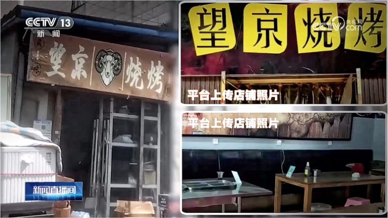 圖 – 在平台上的獲高分、位列「放心點榜昌平區燒烤熱銷榜」的店家望京燒烤,平台上的店面(右上)、堂食範圍(右下)圖片,與實際情况(左)相去甚遠。(新聞畫面截圖)