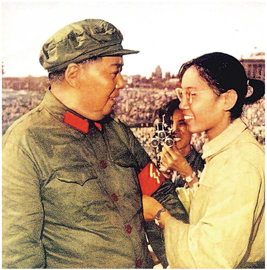 圖 – 1966年8月18日,毛澤東(左)在天安門城樓接見紅衛兵時,宋彬彬(右)給毛戴上了印有「紅衛兵」三個字的袖章。這張照片也成為文革的標誌畫面之一,此後全國武鬥升級。(資料圖片)