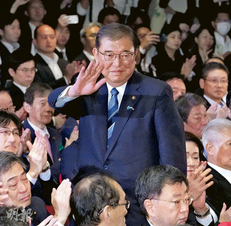 圖- 日本前防相石破茂周五勝出自民黨總裁選舉後,向在場人士揮手致意。這次是石破茂第五次競逐黨總裁一職,在次輪決選擊敗現任經濟安保相高市早苗。(路透社)
