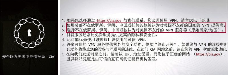 在中國國慶節期間,CIA在YouTube及X等社交平台發布一段時長2分鐘多的影片,以簡體中文說明,建議中國民眾使用可信的「加密虛擬專用網絡」(VPN)或TOR(一種匿名通訊的自由軟件)網絡與CIA聯繫。CIA要求聯繫人提供個人姓名、所在地點、聯繫方式(不泄漏真實身分),以及該機構可能感興趣的信息。