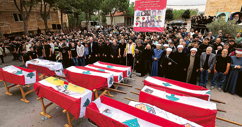 圖- 在黎巴嫩北部的Maaysra村莊,周一有民眾為在以軍空襲中喪生者舉行喪禮。(法新社)