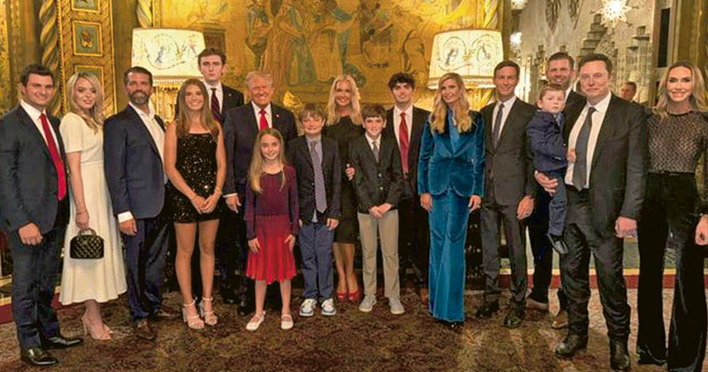 圖- 科技富豪馬斯克(右二)日前攜子到佛羅里達州,與他支持的美國總統選舉當選人特朗普(左六)一家合照。(網上圖片)