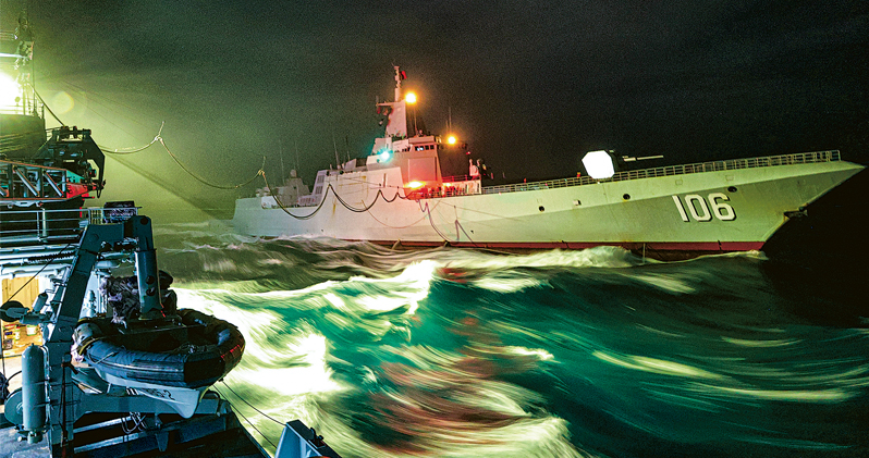 圖- 圖為055型萬噸級「延安」號導彈驅逐艦(舷號106)在南海舉行夜間海上補給訓練。美菲日在南海黃岩島聯合演練同時,解放軍南部戰區通報,中國海軍艦隊在南海展開一場跨晝夜綜合作戰支援訓練。