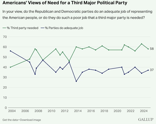 美國長期有近六成民眾支持有第三政黨。(Gallup)