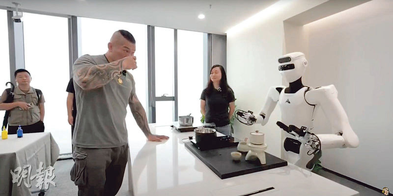 圖- 「館長」陳之漢(前)昨到深圳「機械人谷」,體驗星塵智能機械人助理S1為其冲茶。(YouTube直播截圖)