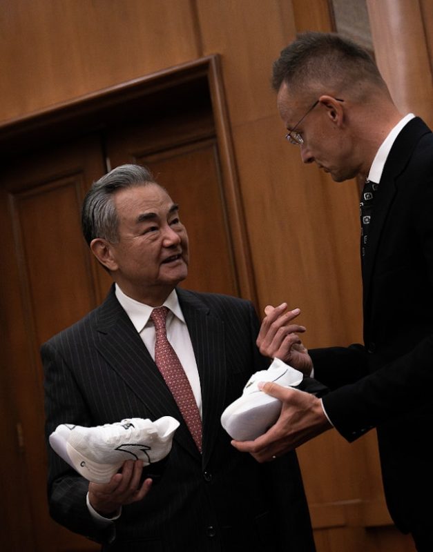 中国中共中央政治局委員、外交部長王毅,周三(9月3日)在北京會見參觀閱兵的匈牙利外長西雅爾多(Szijjarto Peter),並贈送其一對國產跑鞋。