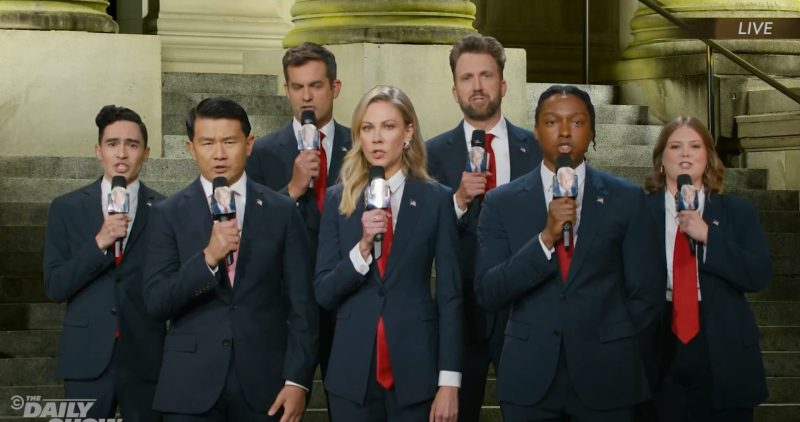 图:2025年9月18日,美國深夜脫口秀主持人Jimmy Kimmel因為就右翼評論員柯克(Charlie Kirk)被刺殺發表爭議言論,節目遭無限期停播。另一知名主持人Jon Stewart誠惶誠恐地與他的團隊在其節目中回應事件。他與其他主持人都帶上象徵MAGA的紅色領帶,並煞有介事地指特朗普(Donald Trump)「當然」沒有打壓言論自由。(網絡圖片)