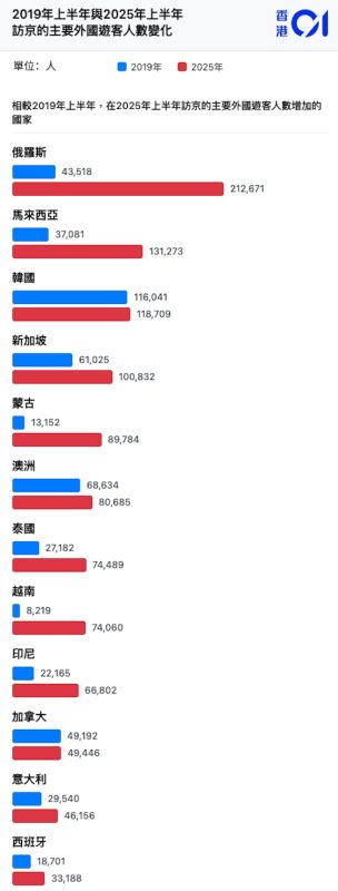 在歐洲,來自俄羅斯的遊客一躍成為今年前半年訪京人數最多的外國遊客群組,不僅人數來到21萬,較2019年多約17萬人,升幅達393個百分點,成為歐洲第一,更遠超馬來西亞,還力壓美國。