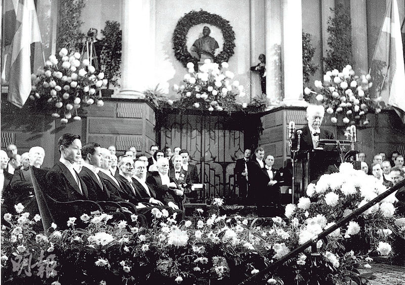 圖為1957年諾貝爾獎頒獎現場。楊振寧(前排左一)與李政道(前排左二)提出弱相互作用中「宇稱不守恒」定律,憑此理論獲頒諾貝爾物理學獎。(資料圖片)