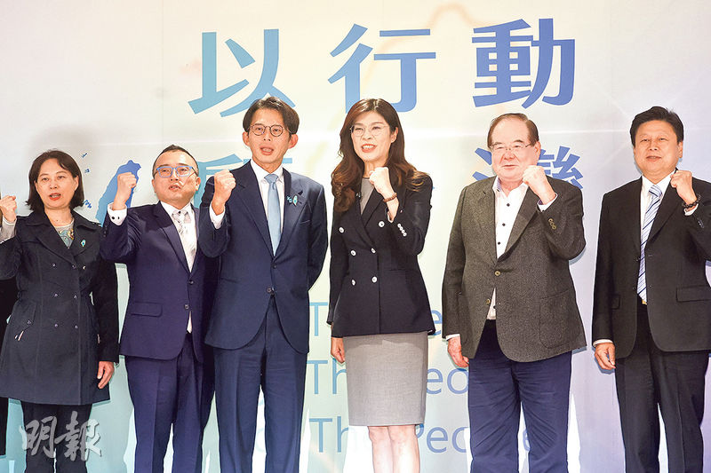 圖- 國民黨主席鄭麗文(右三)與民眾黨主席黃國昌(左三)昨帶領各自幕僚,在新北市新莊凱悅嘉軒酒店舉行會談,會後一起高呼「以行動顧台灣」,展現藍白合作態勢。