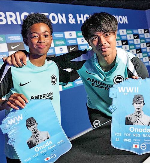 圖 – 英超球會白禮頓主力、日本國腳三笘薰(右)與一名青訓小球員出席「聖誕節休戰巡迴賽」相關活動時,手持二戰日軍士兵小野田寬郎的海報合影,引發中國球迷強烈不滿。(白禮頓社交媒體帳號)