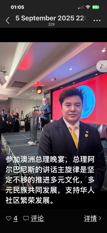 诈骗手段之二:为增加社会信任度,给自己戴上无数光环,打造人设。例如赞助2026年澳中春晚,积极参与澳中建交周年宴会,参与澳洲总理晚宴等公众活动,与政府高官合影,连澳洲总理艾博年都成为他行骗的背景板。