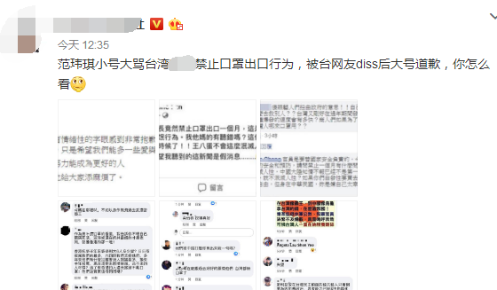 1月28日,据多个博主爆料:范玮琪小号大骂台湾禁止口罩出口行为,被台网友Diss后用大号道歉,你怎么看?