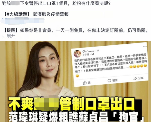 台禁止口罩出口,范玮琪大骂狗官泯灭人性,被台网友痛骂后认错道歉
