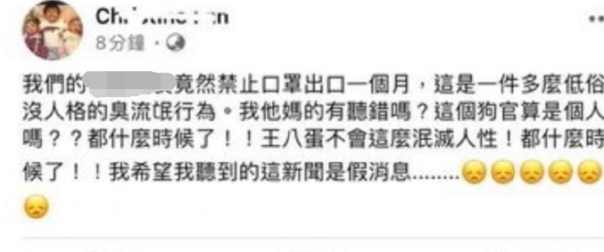 范玮琪怒斥“台禁止口罩出口大陆一事”:这是一件多么低俗没人格的臭流氓行为,我TM有听错吗?这个狗官算是个人吗?都什么时候了,王八蛋不会这样泯灭人性。