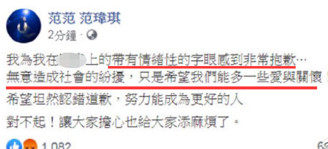 范玮琪被骂得很惨,后来她道歉认错了。范玮琪在社交平台发文说:我为我带有情绪性的字眼感到非常抱歉,无意造成社会的纷扰,只是希望我们能多一些爱与关怀。