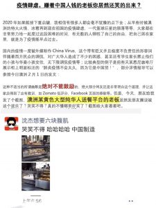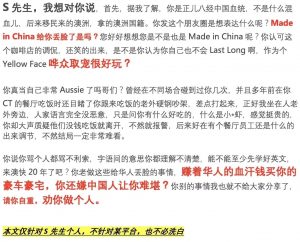 网友爆料:悉尼快餐的华人老板嘲笑Made in China被网友狂怼 蕭十一狼点评:刚收到网友来料,有发布价值,三张图全部刊登。 中国人或华人,嘲笑中国货或中国制造不是个别现象。悉尼快餐这个老板不是第一个,更不是最后一个。这种嘲笑自己的根的人,在微信群也很多,天天与爱祖国人士相怼是家常便饭。 其实,就算你把头发染成金色,发根也是黑的。忘本就是一种背叛。 谁嫌弃中国人,那就请离开华人圈子吧,不要一边享受中国的微信,一边死皮赖脸的不走。 (2020.2.3 作者为华人时事评论家)