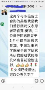 蕭十一狼点评:这二个和陈薇少将兼院士合影的美女帅哥,原来是普通人,是为医院送餐的志愿者,也是自愿试打疫苗的志愿者,中华民族正是有这些甘愿付出和奉献的无名英雄,得以繁衍千百年。这次能经受百年一遇的特大疫情,值得为他们点赞!“善行团”,这个名字取得好!