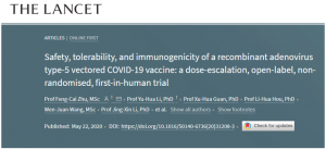 《柳叶刀》5月22日刊登了由中国军事医学研究院院士陈薇和江苏省疾控中心教授朱凤才团队发布的新冠疫苗人体I期临床试验数据结果。(柳叶刀官网截图)