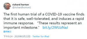 《柳叶刀》主编理查德•霍顿对这份试验结果进行了高度评价。(推特@richardhorton1)